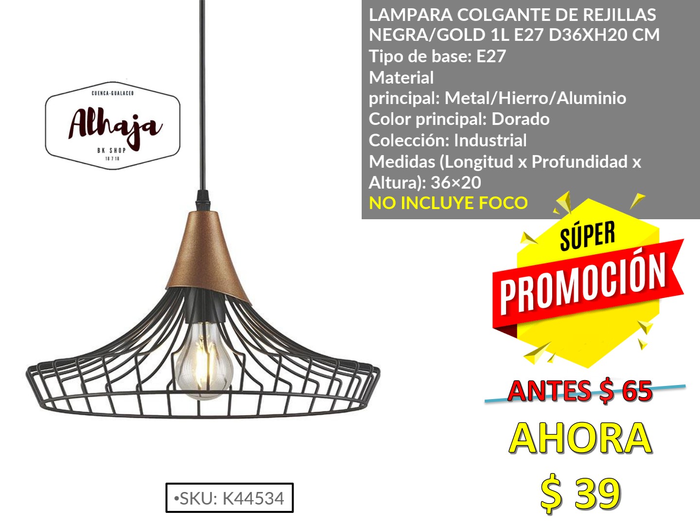 LAMPARA COLGANTE DE REJILLAS NEGRA/GOLD 1L E27 D36XH20 CM