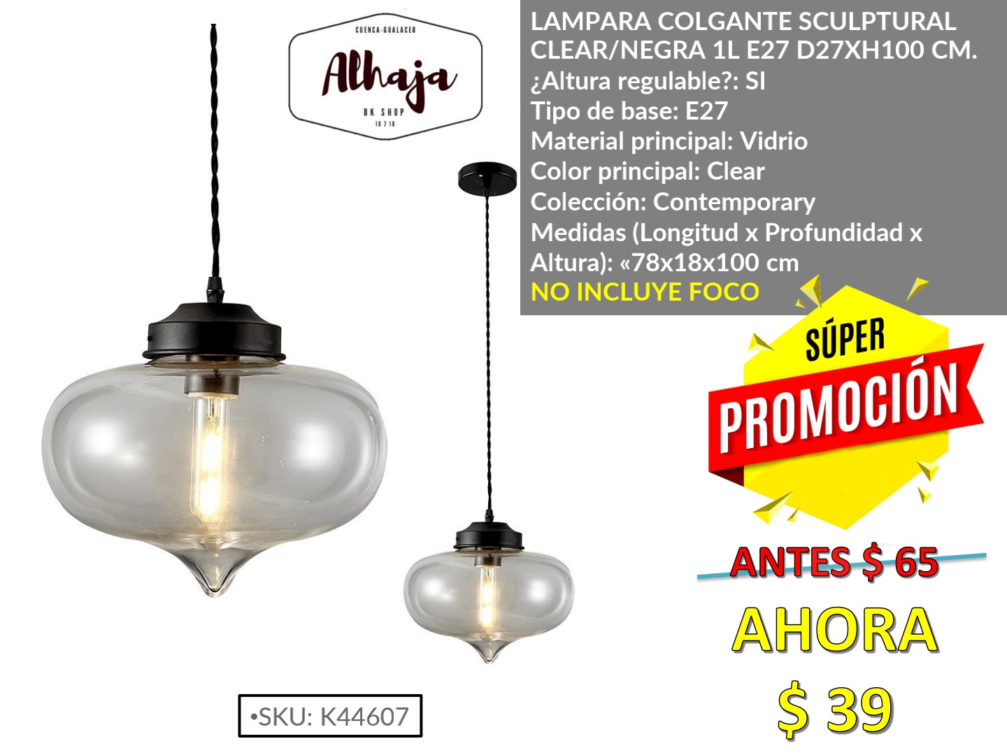 LAMPARA COLGANTE SCULPTURAL CLEAR/NEGRA 1L E27 D27XH100 CM.